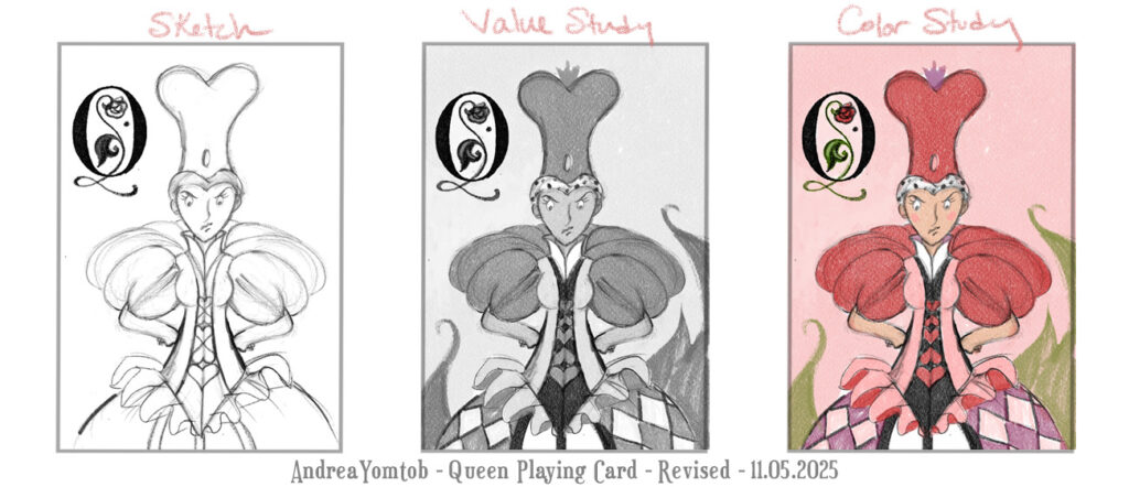 I designed first by sketching in non-photo blue pencil. Then, I refined with pencil. I focused on the Queen, primarily. I worked through a value study and a color study before painting in watercolor.