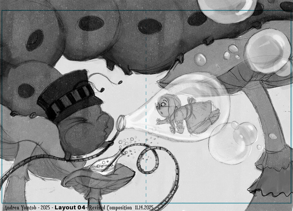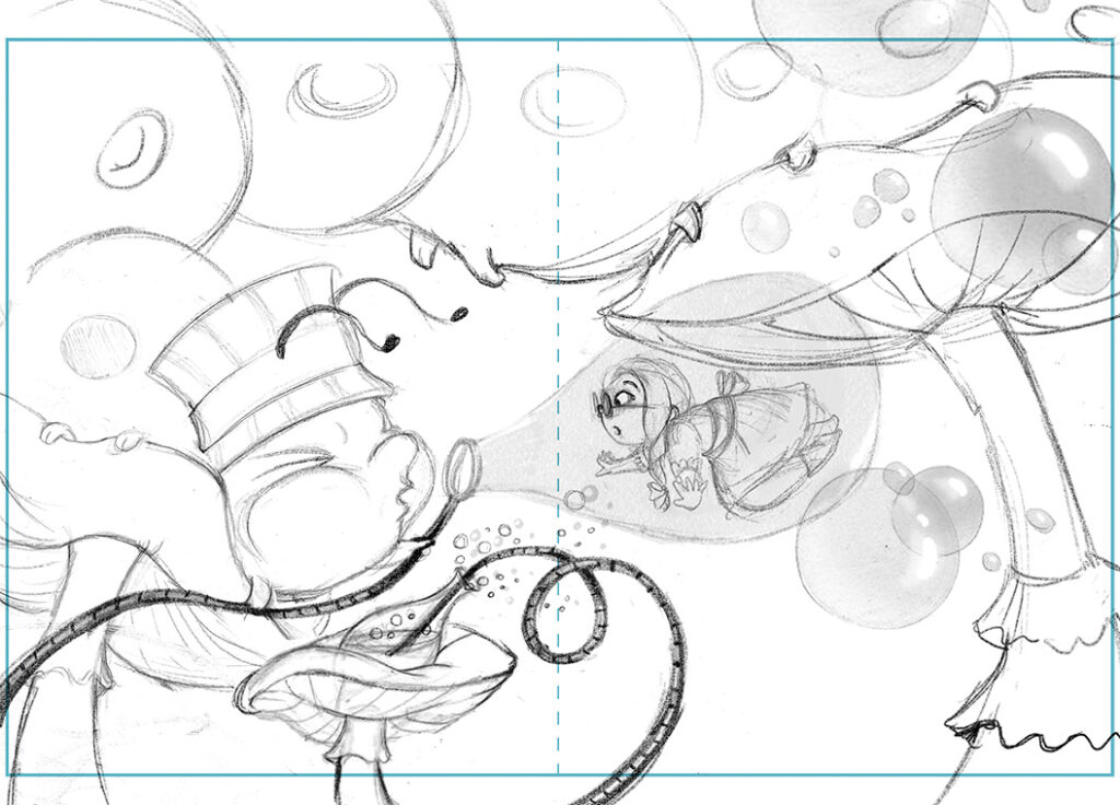 Nina reviewed many different composition and design rules. I sketched out three double-page spreads for ideas on the same scene. I had great feedback from Nina. I went with a double-page spread. Here is a sketch and value study. I’m still working on the final painting and will post it here when it’s done.